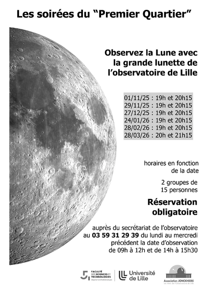 Durant la saison d'hiver, les amis de l'observatoire de Lille vous proposent des soirées d'observation de la Lune certains soirs, le samedi le plus proche du premier quartier.